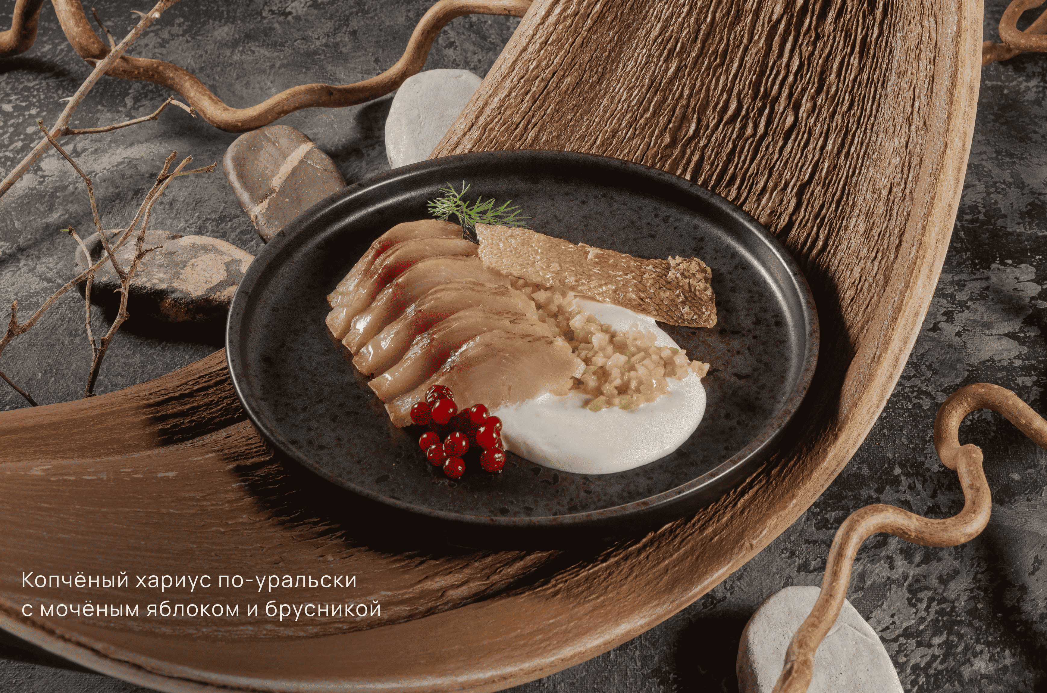 1 курс: Копченый хариус по-уральски с моченым яблоком и брусникой